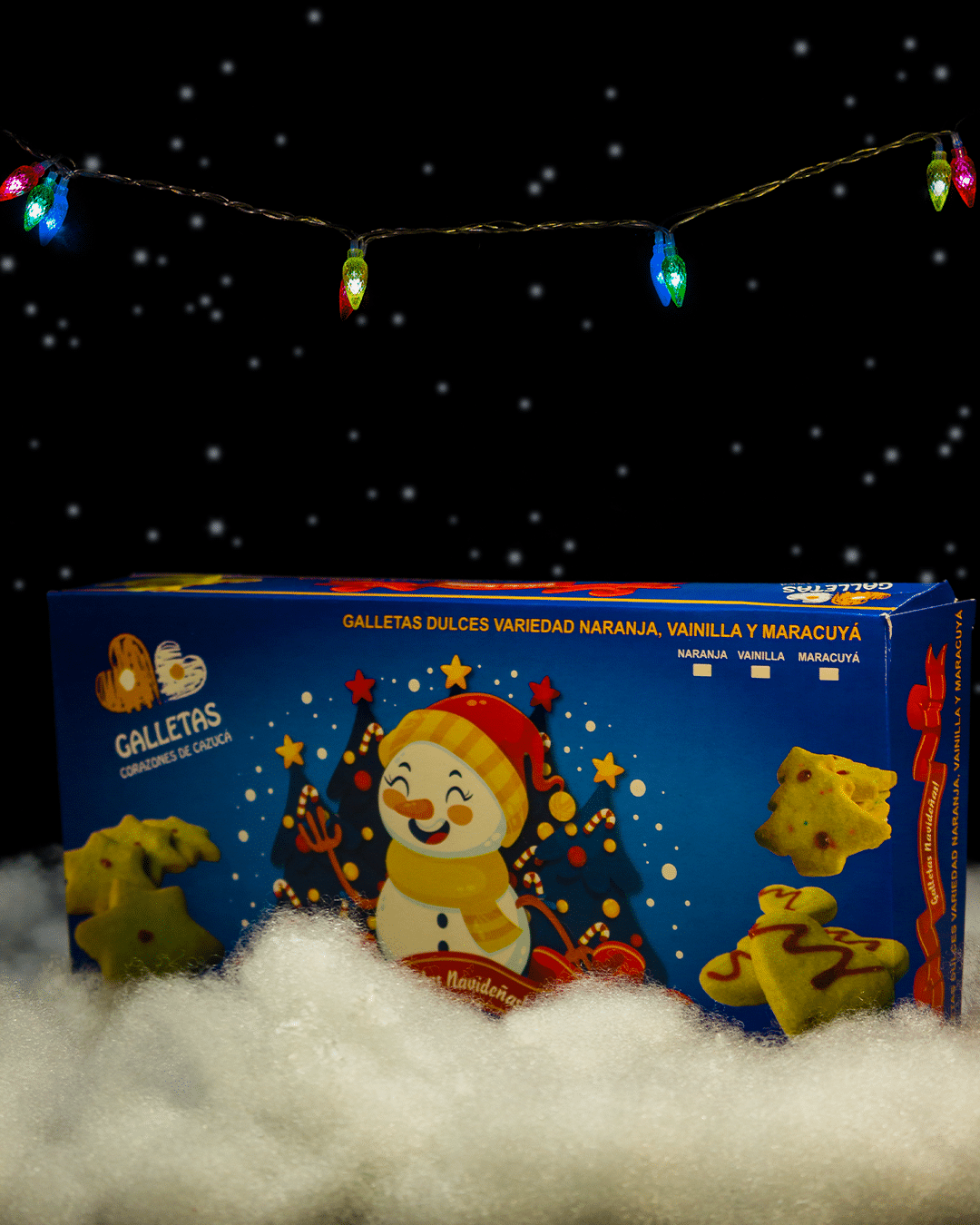 Caja Motivo navideño contiene 30 deliciosas galletas diseñadas con figuras navideñas de 5 g sabor (Coco, vainilla, naranja)