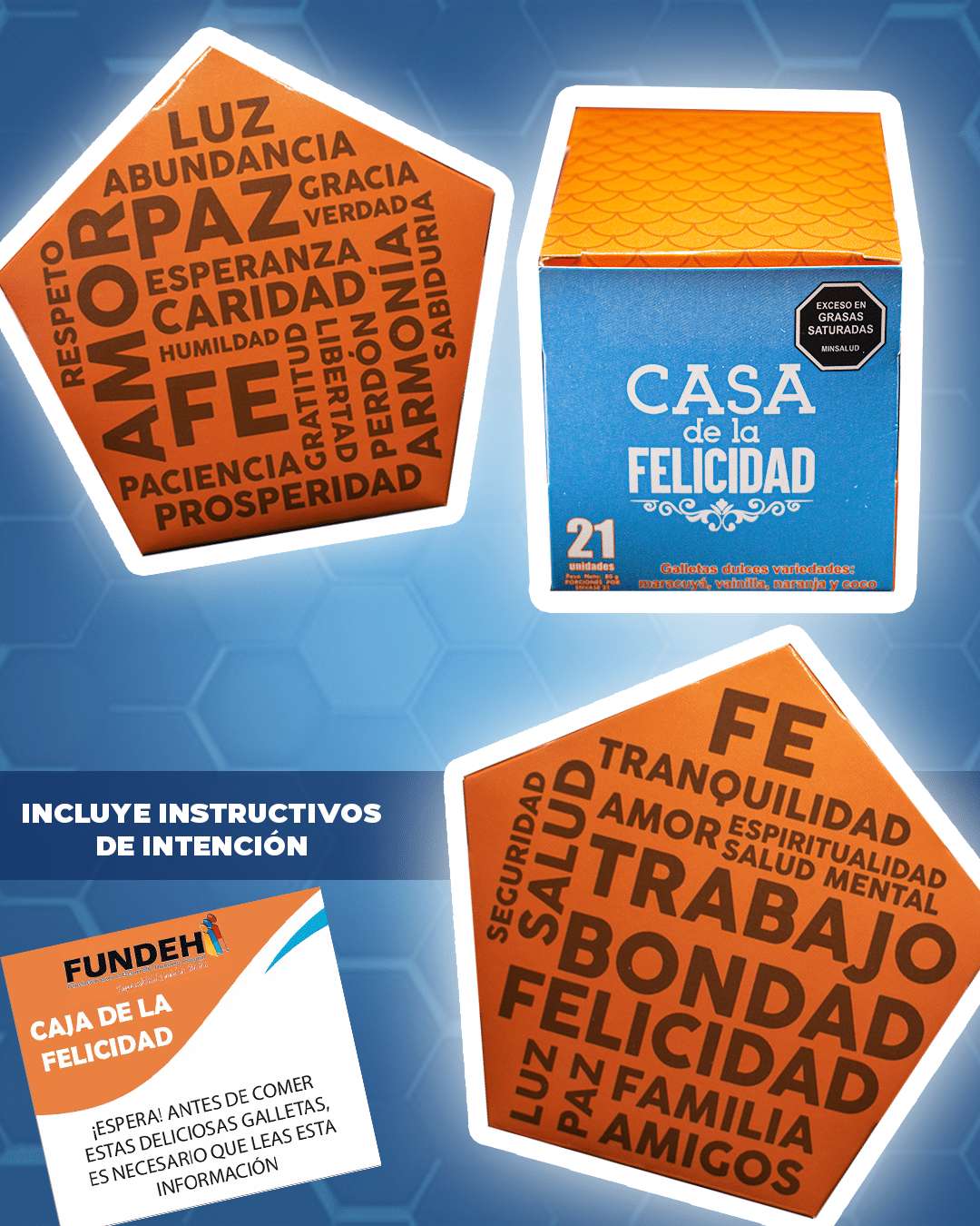 Esta caja casa de la felicidad es especial porque te enseña cómo reprogramar tu mente y generar un hábito por medio de un alimento, contiene 21 deliciosas galletas de 5 g sabor a de chips de chocolate adicional trae instructivo de uso.
